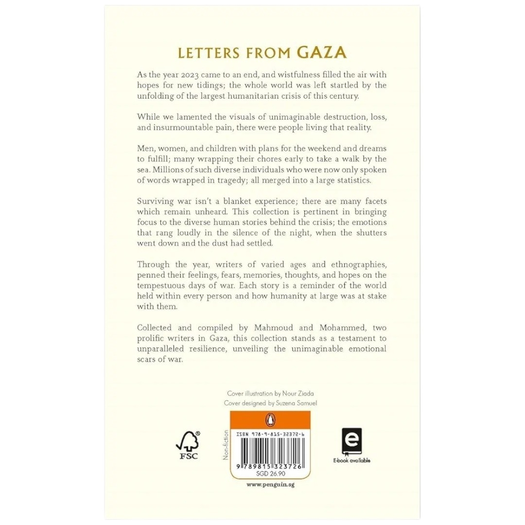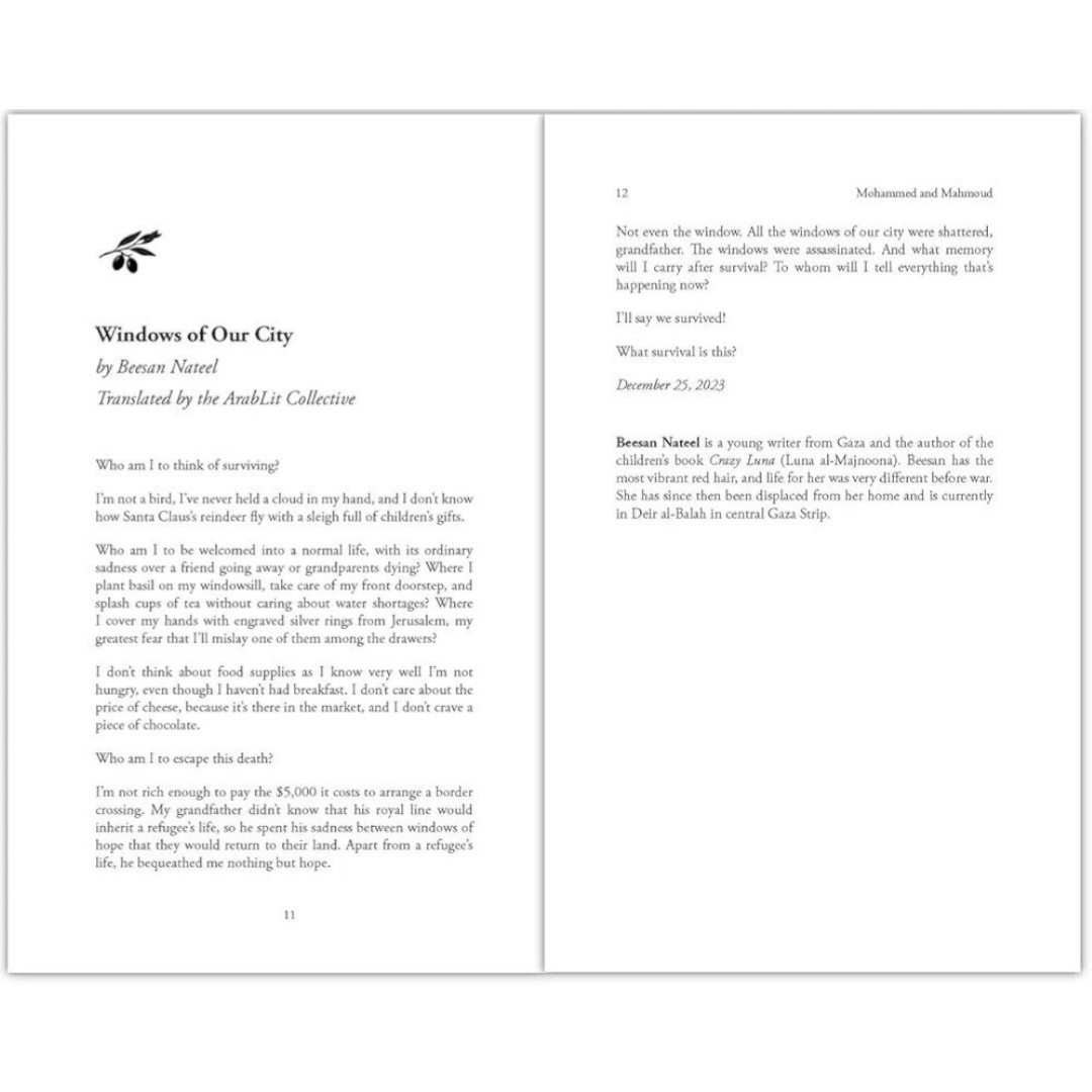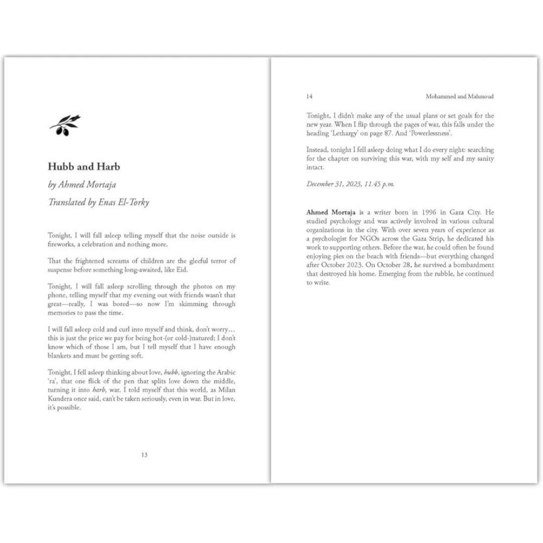 Collected and compiled by Mahmoud and Mohammed, two prolific writers in Gaza, this collection stands as a testament to unparalleled resilience and unveils the unimaginable emotional scars of war; leaving us overcome with tenderness and compassion.